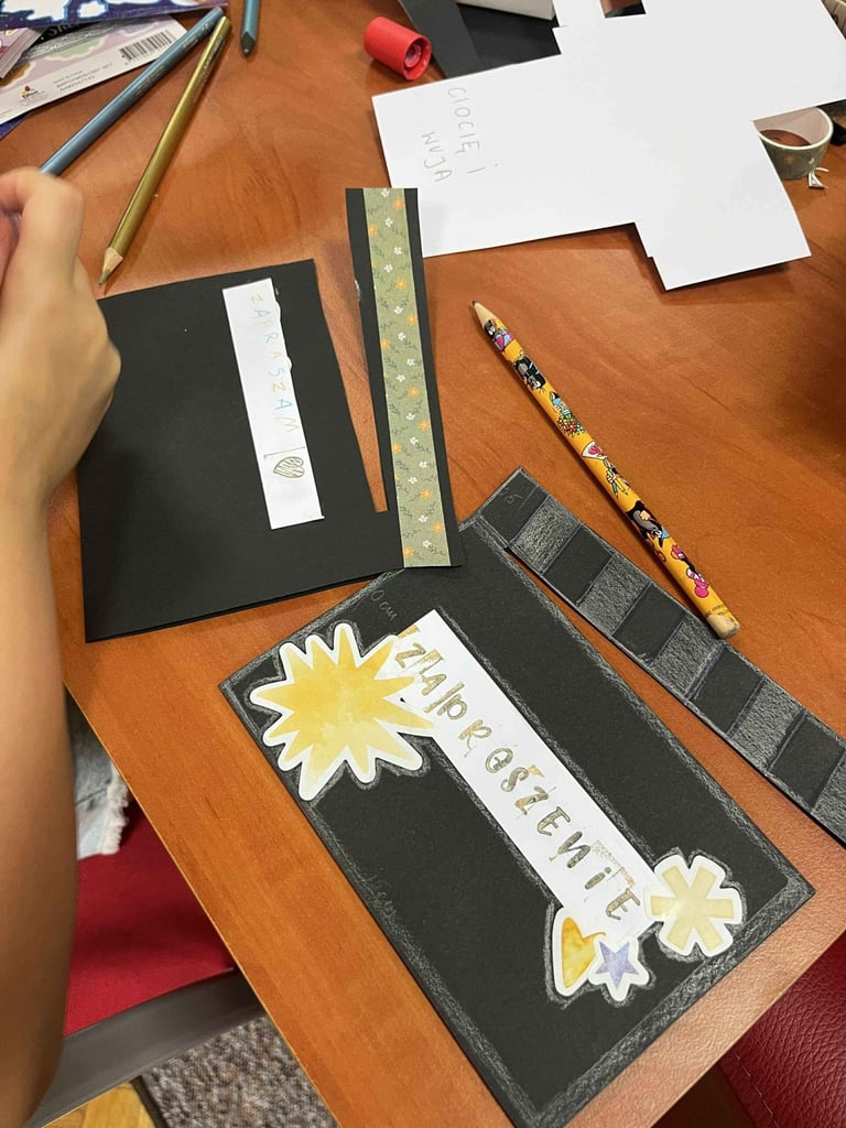 Uczestnicy z ogromnym zaangażowaniem wcielali się w rolę twórców – wymyślali pytania do quizów, dyskutowali o ulubionych scenach filmowych i projektowali własne zaproszenia na wieczór filmowy. Zajęcia przebiegały w twórczej, przyjaznej atmosferze, łącząc naukę z dobrą zabawą i wspólną pasją do kina.